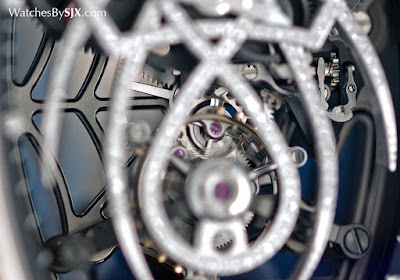 Als deutlich skelettiert, ist viel von der Bewegung unterhalb der Spinne sichtbar. Die Platte auf der Rückseite der Uhr, die aus schwarz-beschichtetem Weißgold gefertigt ist, wird in ein Spinnennetz gearbeitet und dann mit schwarzen Saphiren gesetzt. Gemacht von respektierten Kompilations-Spezialisten Renaud & Papi, ist die Bewegung Hand-Wunde und fertig in einer unfussy Art und Weise, mit den meisten der Komponenten schwarz oder grau.