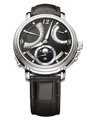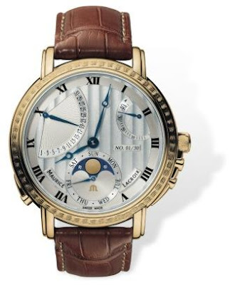 Im Jahr 2005 startete Maurice Lacroix das Modell, das Masterpiece Lune Rétrograde, das neben der Mondphase - innerhalb von 29,5 Tagen um 6 Uhr durch ein halbkreisförmiges Fenster fährt - auch Datum, aktueller Wochentag und Gangreserve . Eine kleine Hand zeigt die Wochentage, deren Namen sich um die Mondphasenanzeige befinden. Die Datumsanzeige um 10 Uhr ist eine sogenannte retrograde Anzeige. In dieser Anzeige bewegt sich die Hand im Laufe eines Monats durch ein breit gefächertes Segment und kehrt am Schluss sofort in ihre Ausgangsposition zurück. Maurice Lacroix kann nun auch in diesem Bereich ein außergewöhnliches Kompetenzniveau zeigen. Gegenüber dieser Angabe, um 2 Uhr,